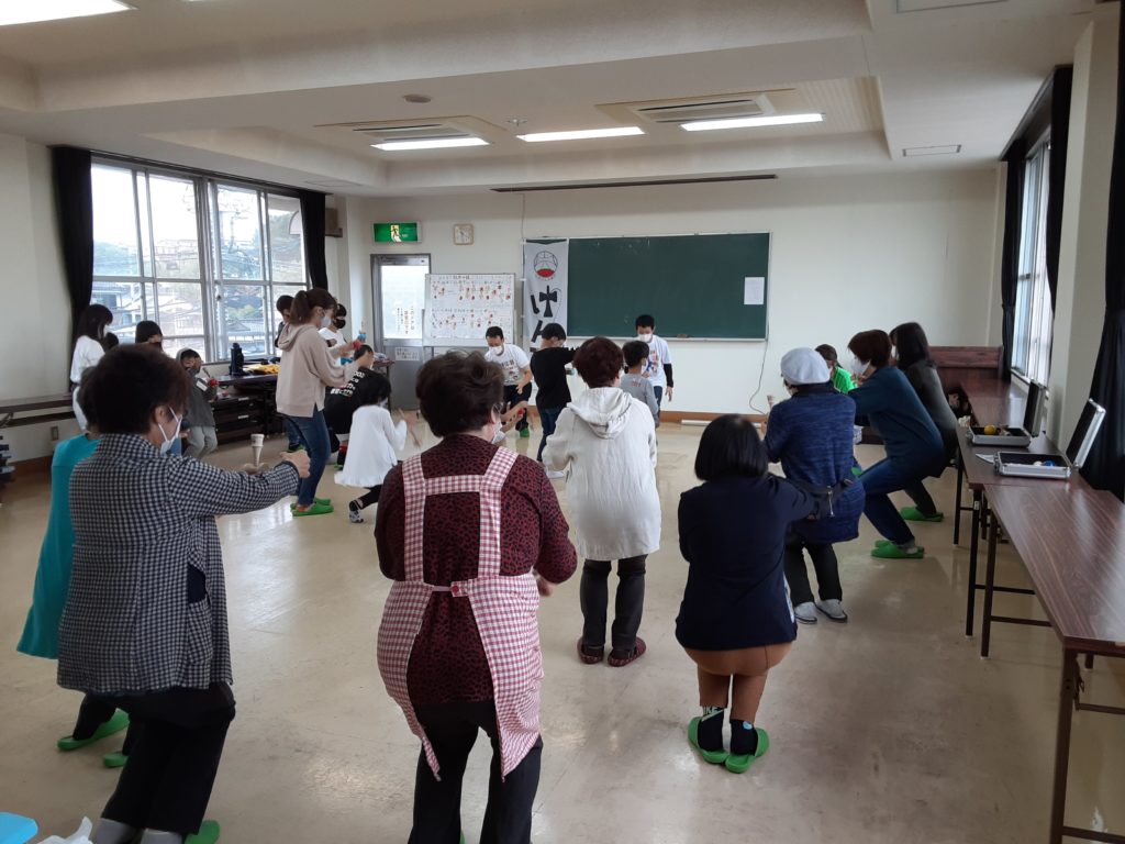 けん玉は”ひざ”を使って皿に乗せるのがポイントで、その様なひととおりの基本動作を学んだ後、小グループに分かれて円になり、段々難しいわざにもチャレンジしました。曲に合わせて和気あいあいとした雰囲気の中で、子どもも大人も楽しめました。周南けん玉教室の皆様ありがとうございました。また機会がありましたら宜しくお願いいたします。