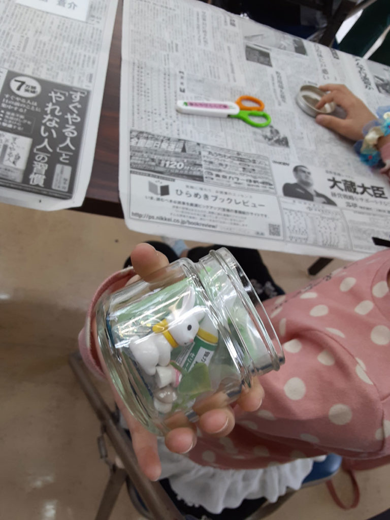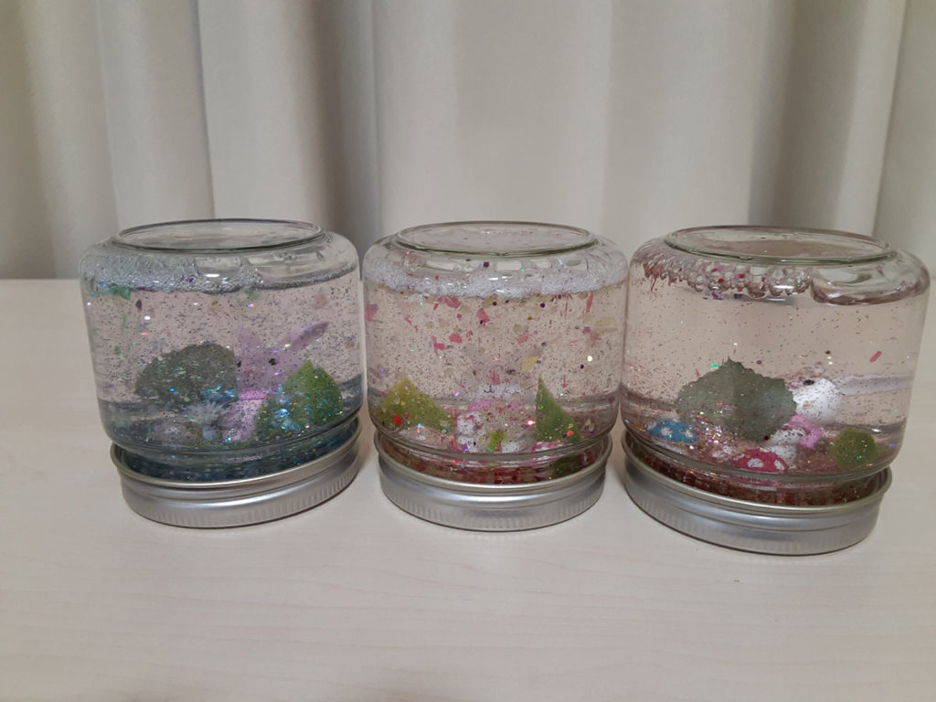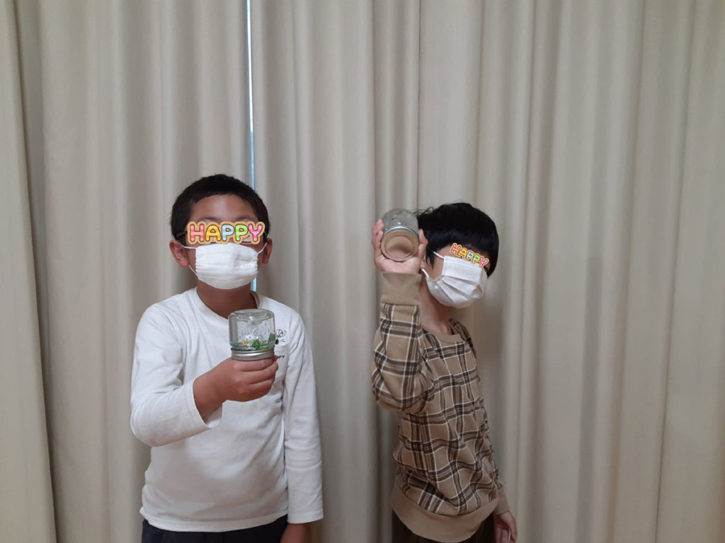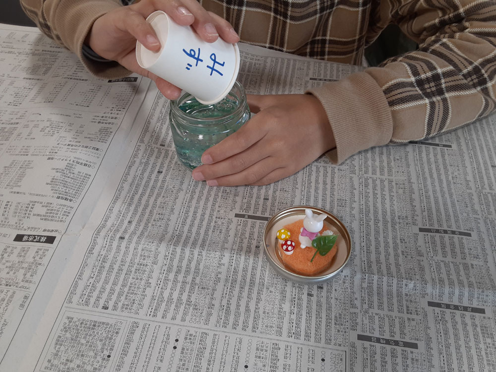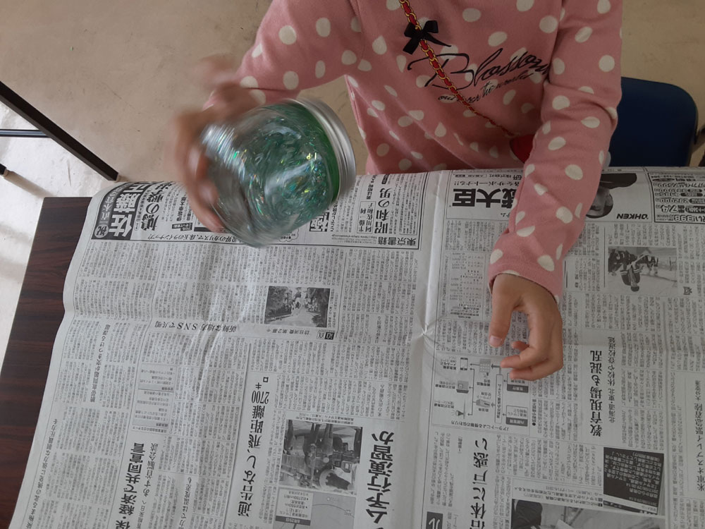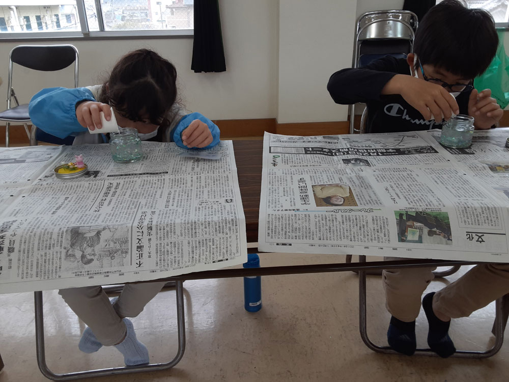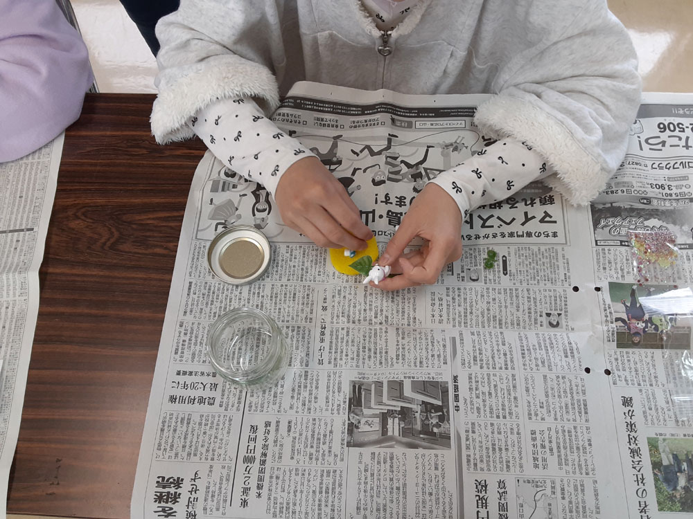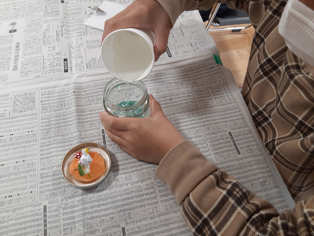昨年12月に「消しゴムはんこ」を教えてくださった”みやび”先生をお招きして、スノードームを作りました。ガラス容器の中で雪がキラキラと舞い上がる仕組みに興味津々。”振っては落ちる”を繰り返し、楽しみました。