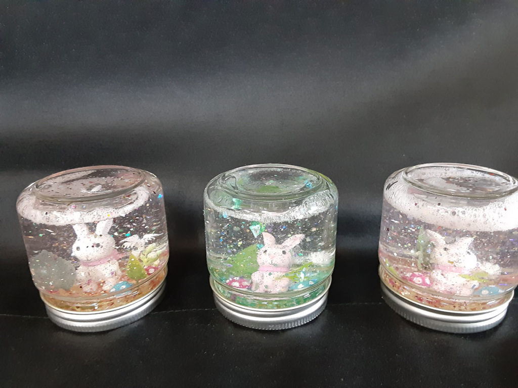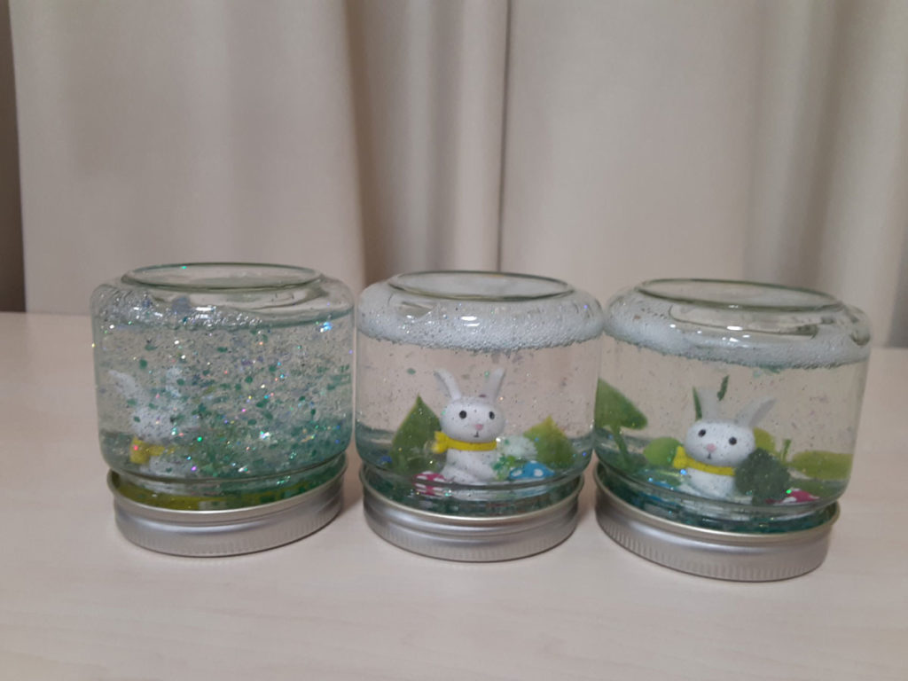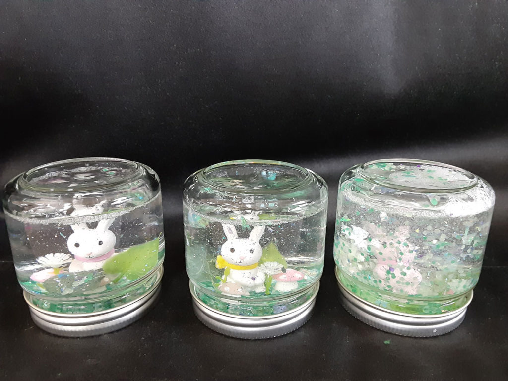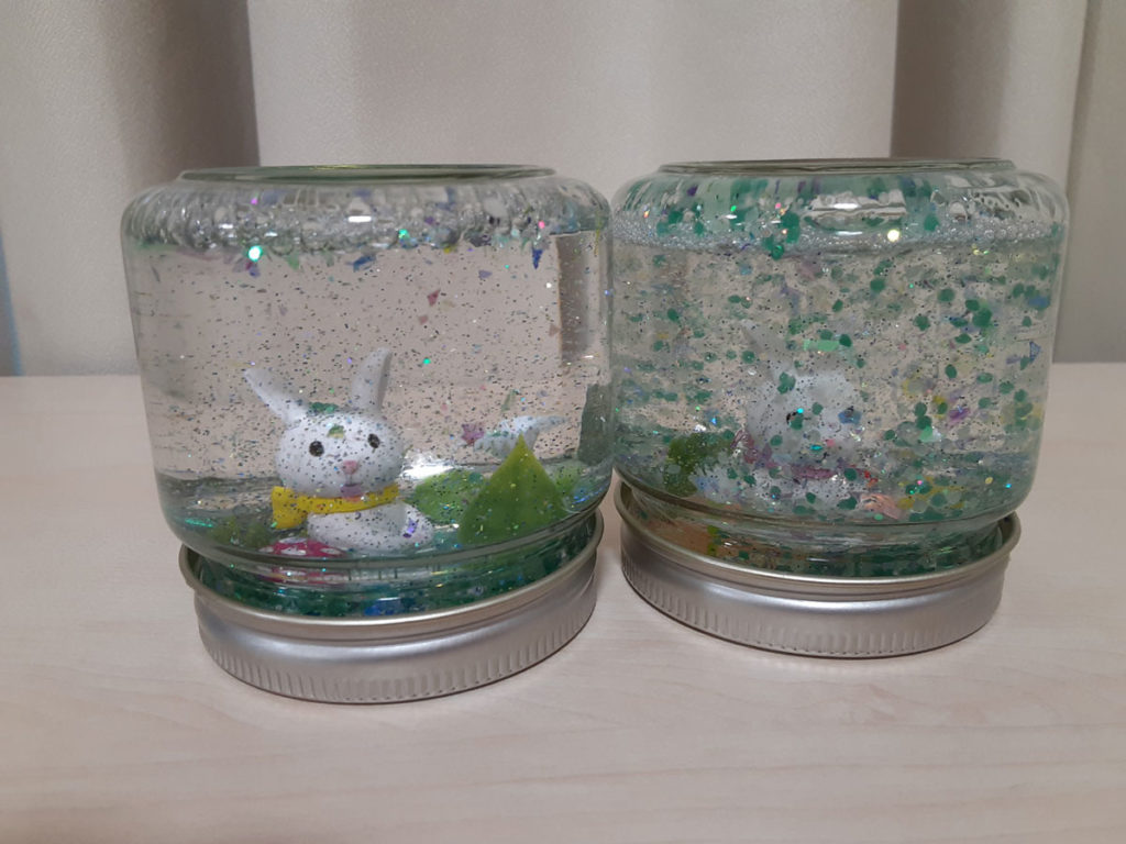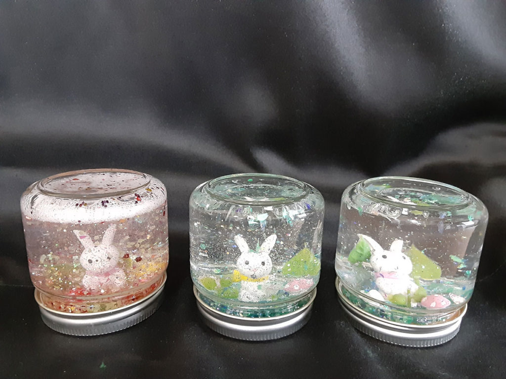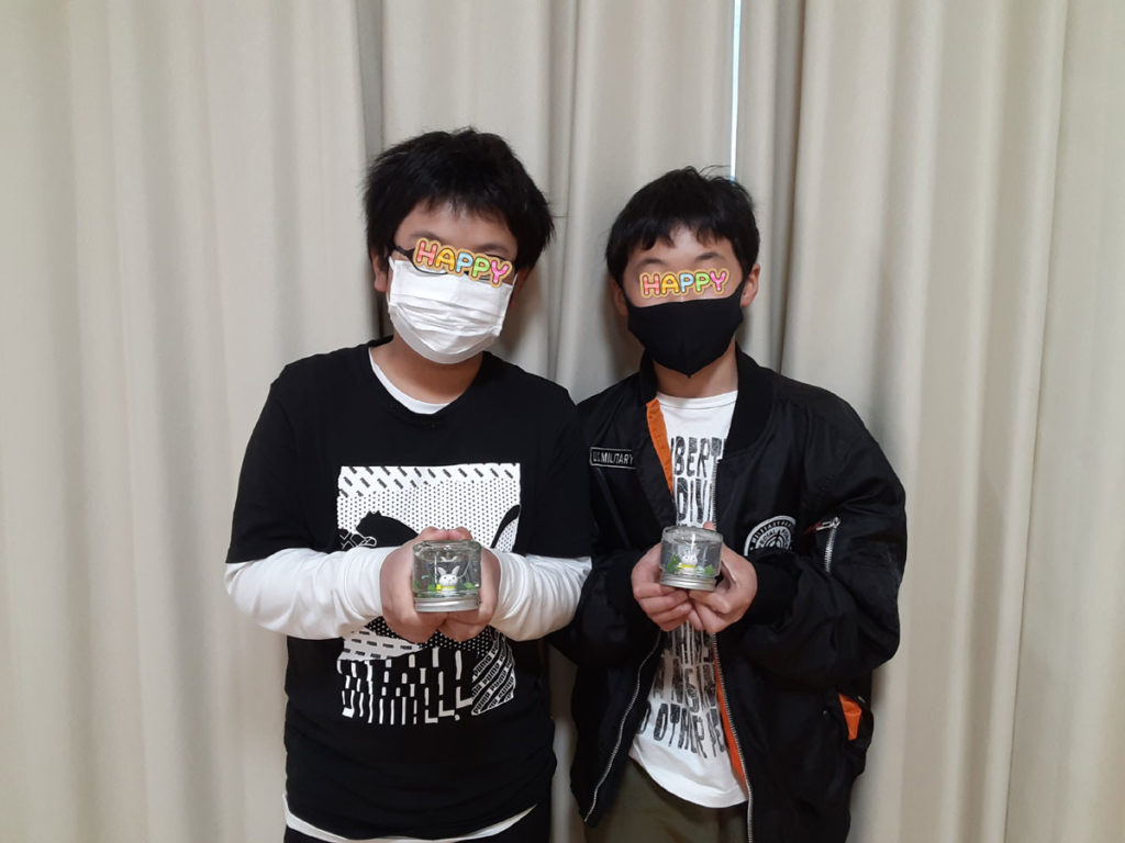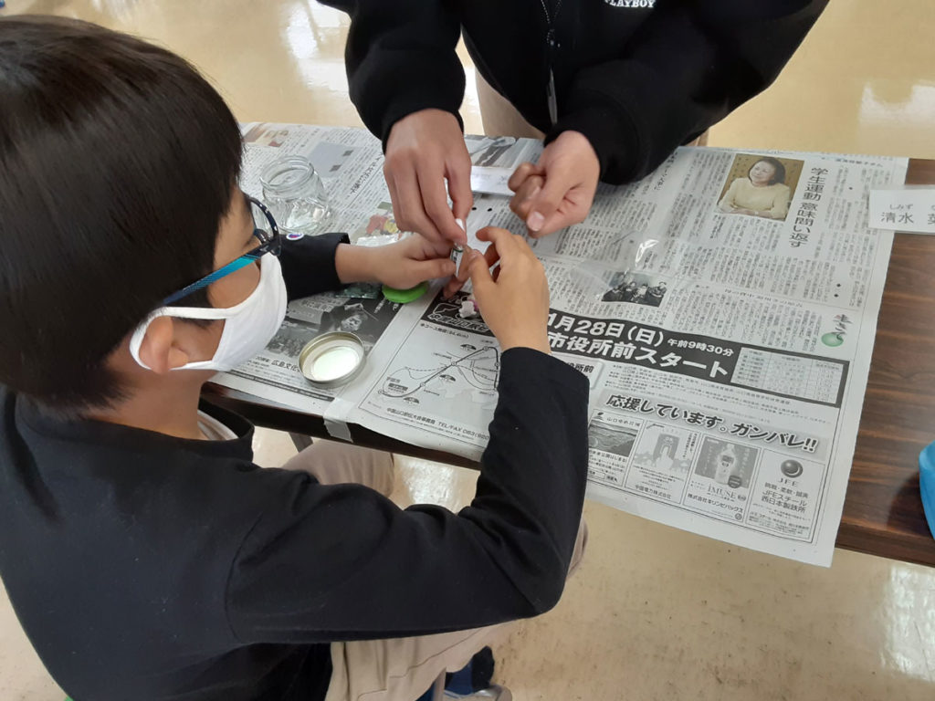 昨年12月に「消しゴムはんこ」を教えてくださった”みやび”先生をお招きして、スノードームを作りました。ガラス容器の中で雪がキラキラと舞い上がる仕組みに興味津々。”振っては落ちる”を繰り返し、楽しみました。