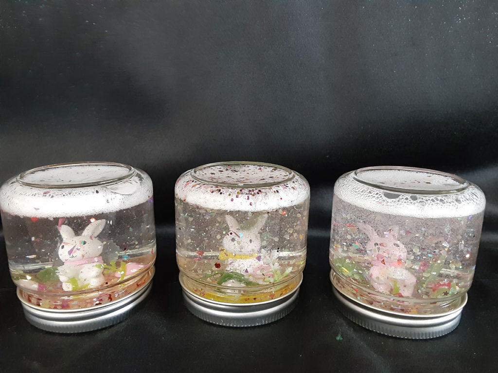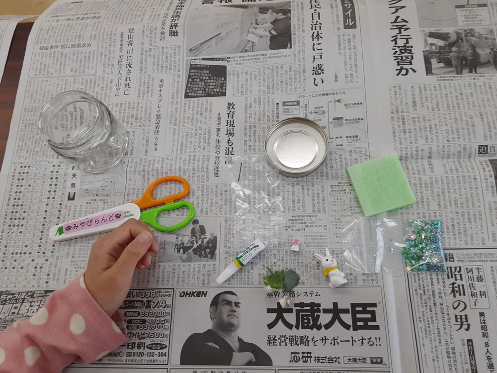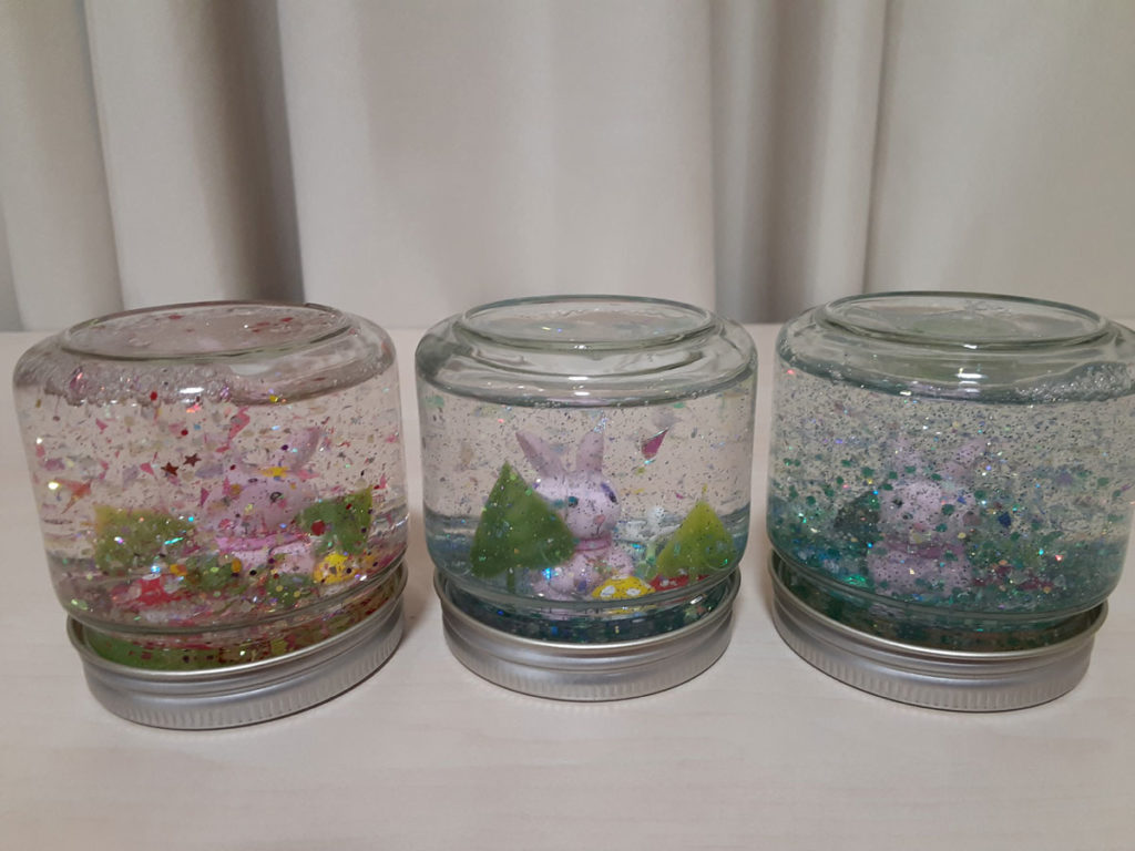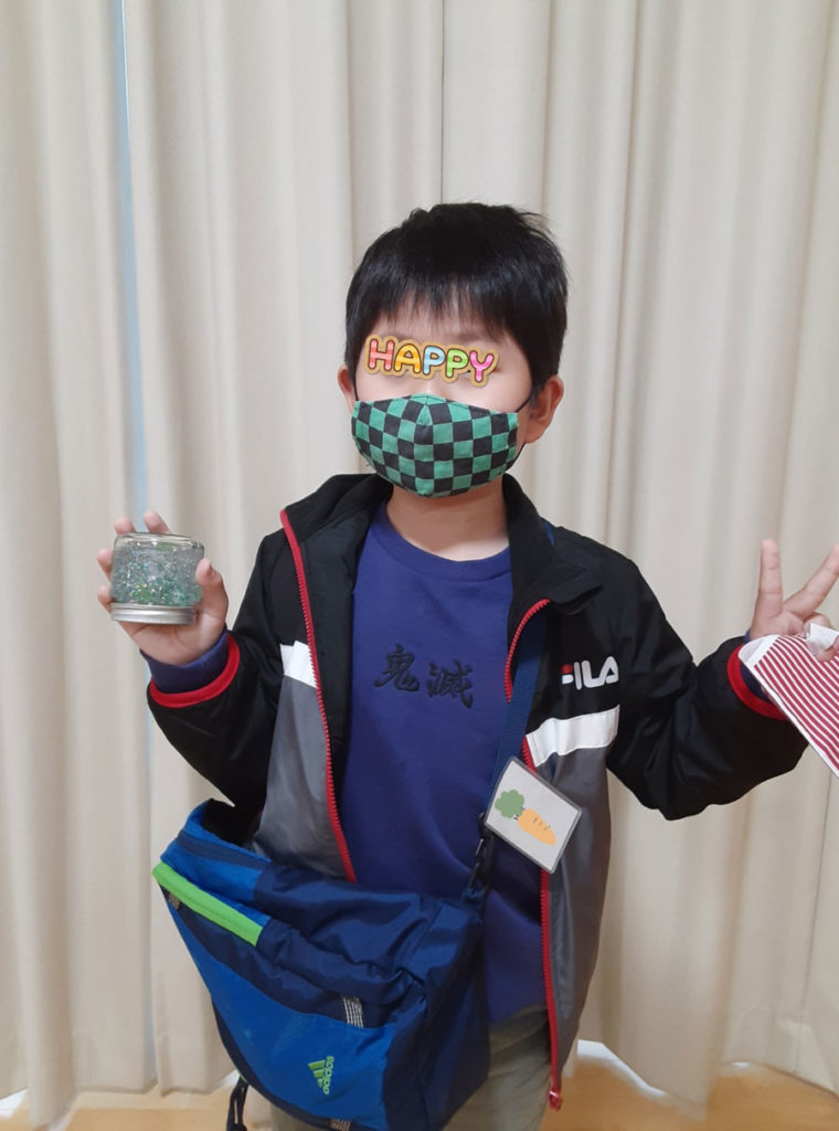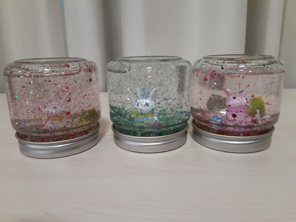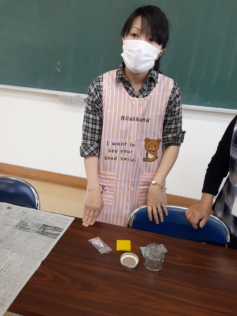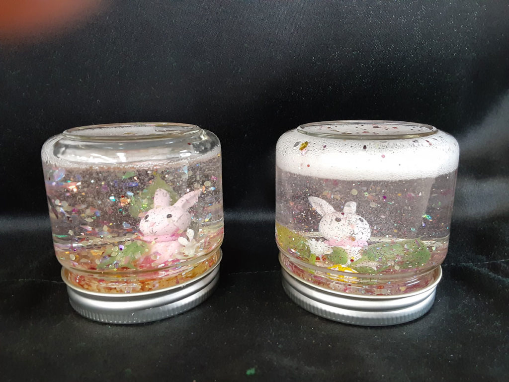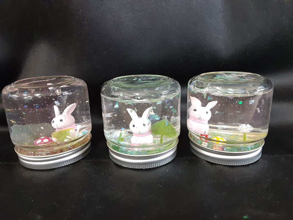 昨年12月に「消しゴムはんこ」を教えてくださった”みやび”先生をお招きして、スノードームを作りました。ガラス容器の中で雪がキラキラと舞い上がる仕組みに興味津々。”振っては落ちる”を繰り返し、楽しみました。