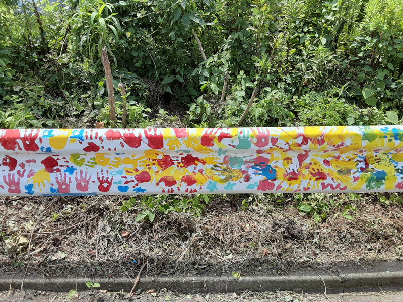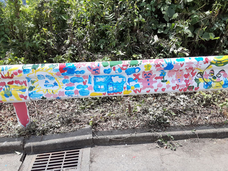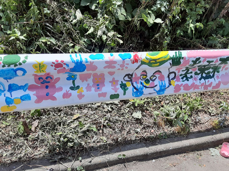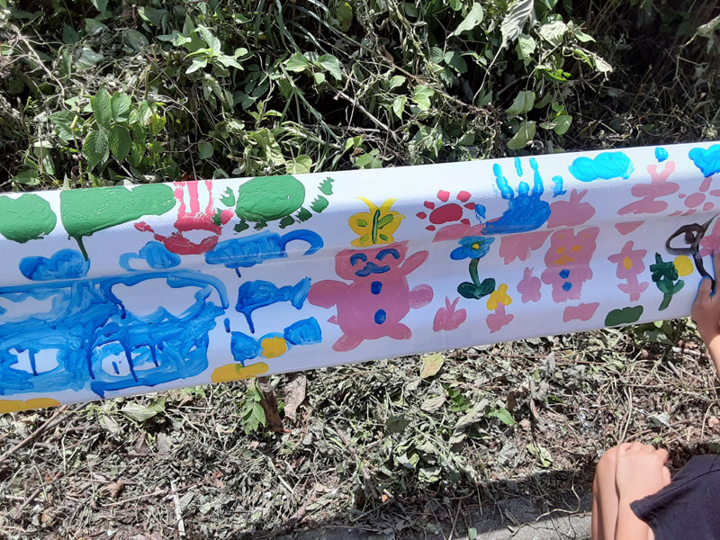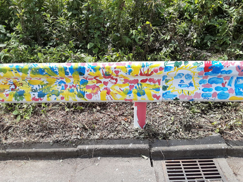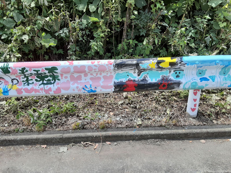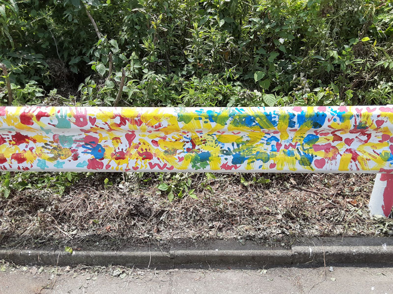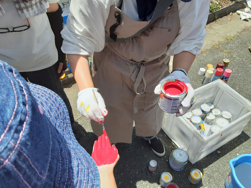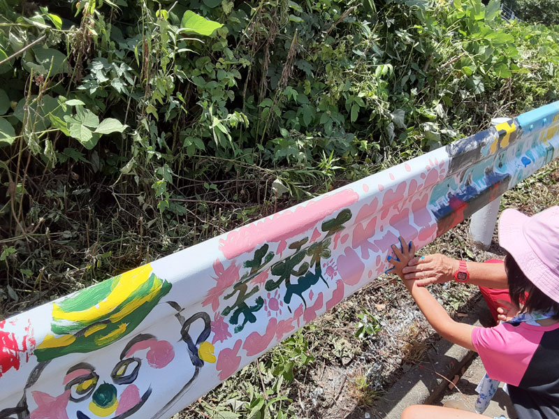 ②掌に好きな色のペンキを塗ってガードレールに手形をつけていく 手が嫌な子は絵筆でかく 描くスペースが足りず、ガードレールの裏側にもかきました