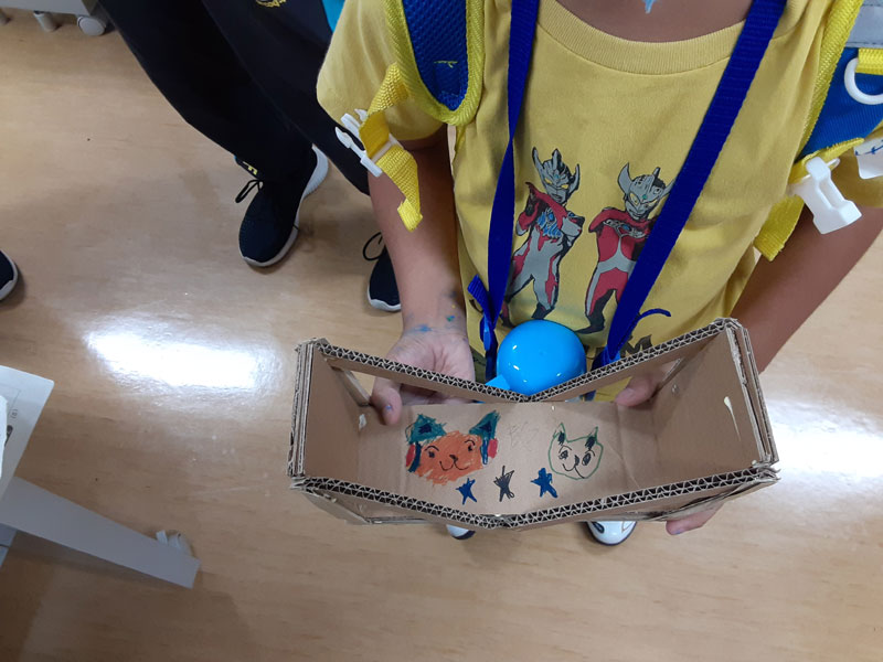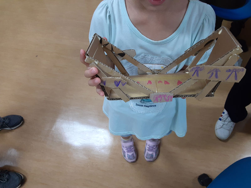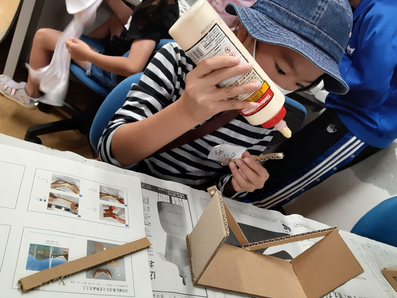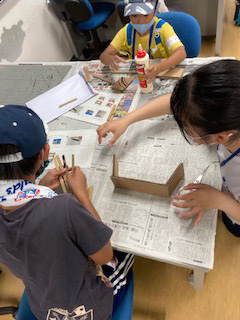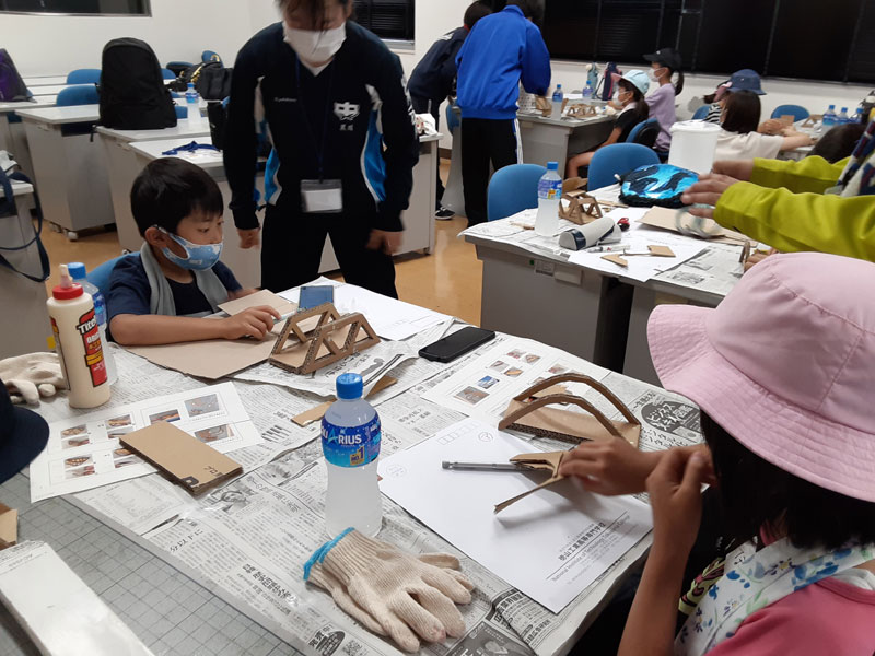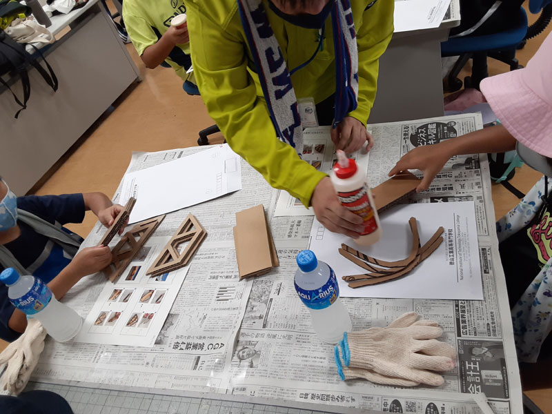 ③休憩時間に高専生の用意してくれた工作を行う【あらかじめ用意された3種類から好きな物を選んで、ダンボールをカットしたキットを貼り合わせて吊り橋などの構造物をつくり、色をぬったり、絵をかいたりする】