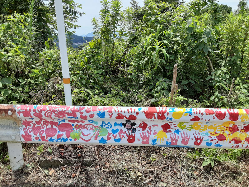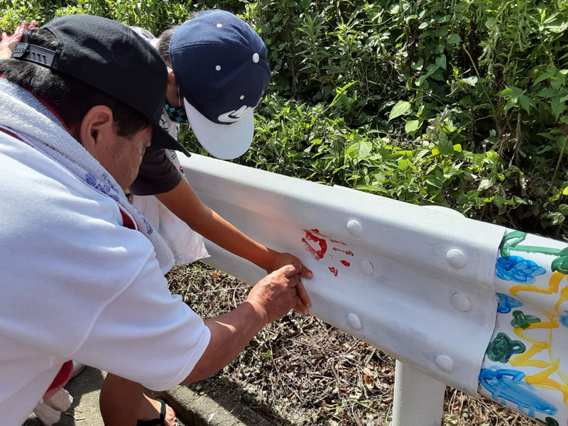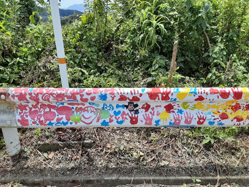 ④ガードレールに自分のかいたところに、記念の手形を押す