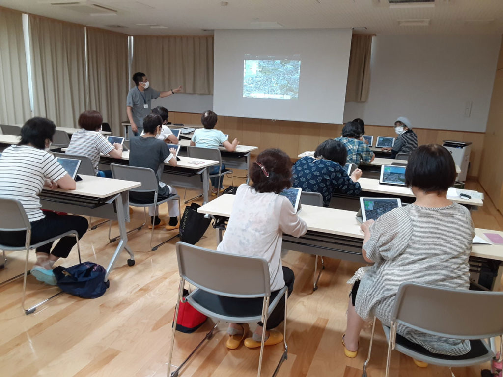 日頃みんなの久米ハウスに会場を提供して頂いている児童家庭支援センターの “ぽけっと” さんのお計らいでタブレット講習会を開催していただきました。みんなの久米ハウスのボランティアを含む地域の福祉員さんや民生委員さん、食推さん、母推さんの方々が参加して周南市のハザードマップで防災知識を学びました。