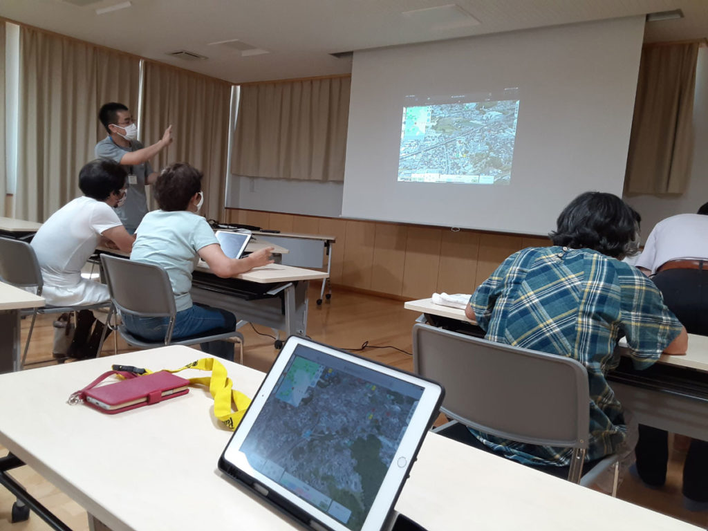 講師として地区自主防災の温品さんと岩田さんが来られ、マップの表示の仕方や危険地域の情報の見方をわかりやすく丁寧に教えていただきました。関係者の皆さま、ありがとうございました。