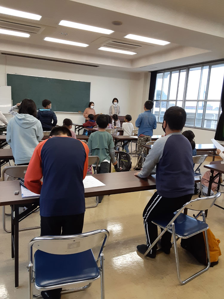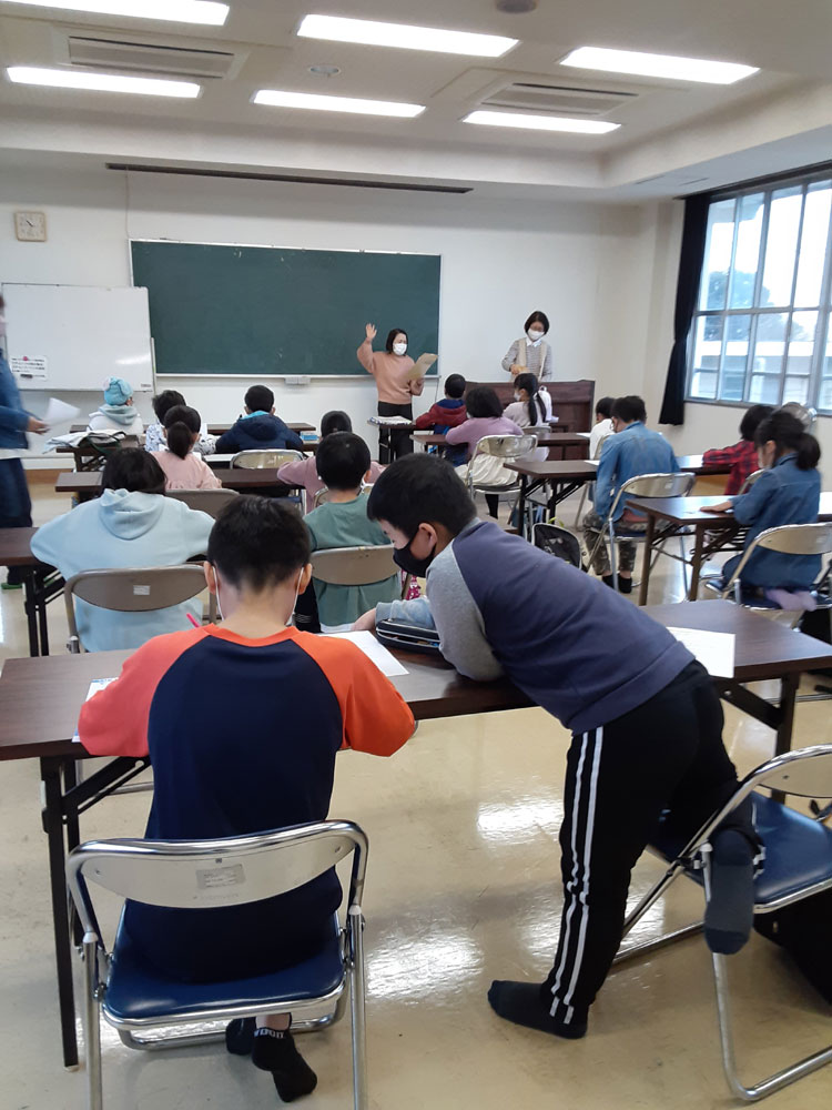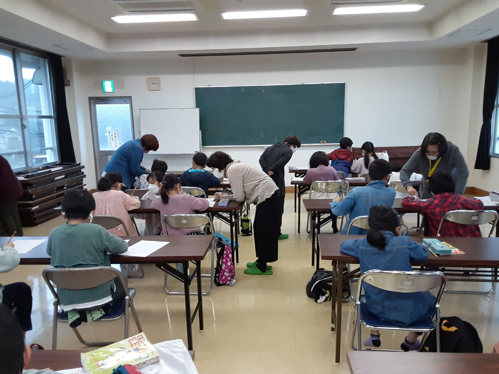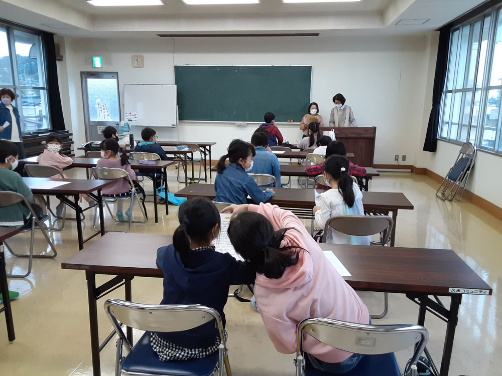 令和3年度最後の「みんなの久米ハウス」は自学自習のあと、”お楽しみ会”として、〇✖クイズやお絵描き伝言ゲーム、ビンゴをしました。〇✖クイズでは、久米地区や周南市の歴史についての地元クイズと、防災クイズを出題しました。お絵描き伝言ゲームは数十秒で絵を描き、上手に次々に伝えていました。ビンゴでは上がった人からお菓子のつかみ取りをしました。会が終わってから、クイズの内容が勉強になったことや、皆でゲームを楽しめて良かったという感想がほとんどの子供たちから聞けました。