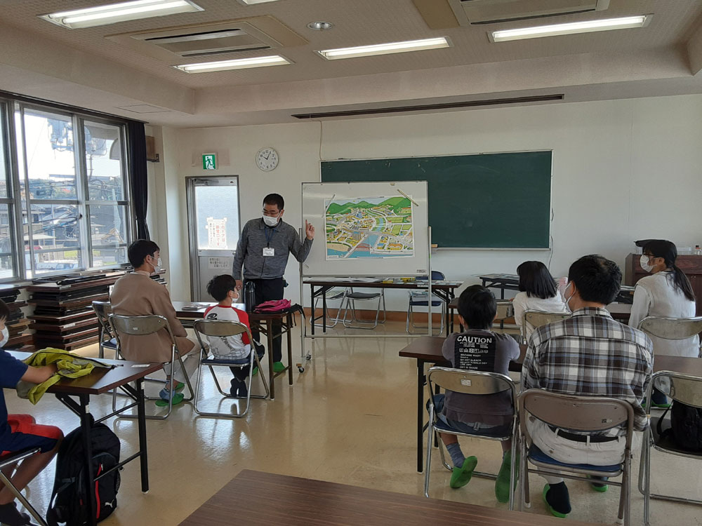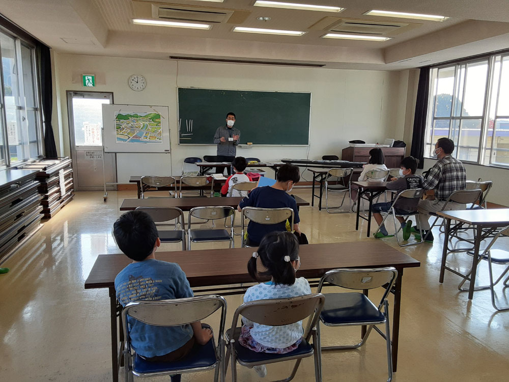 久米地区自主防災協議会の方を講師にお招きし、親子で防災について勉強しました。地図を使って、災害予測や避難方法について、みんなで考えました。