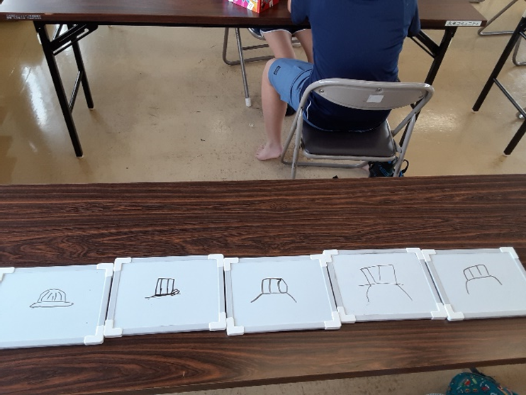 ホワイトボードを使った伝言ゲームをしました。お題は帽子です。