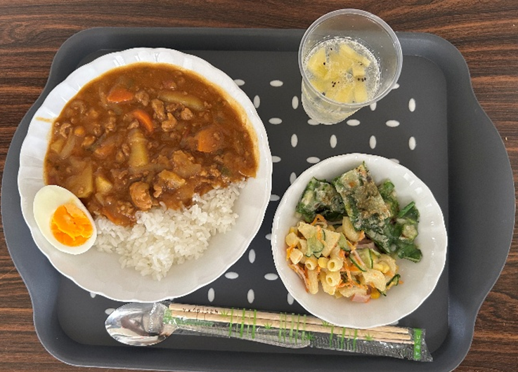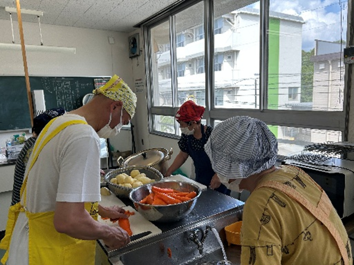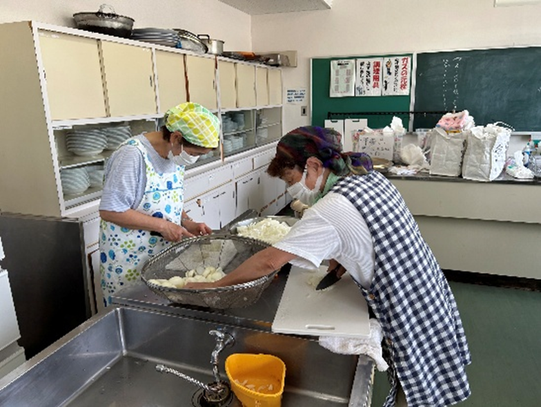 地域の方やアルク秋月店様から青果の提供を受け調理した昼食をみんなで食べました。