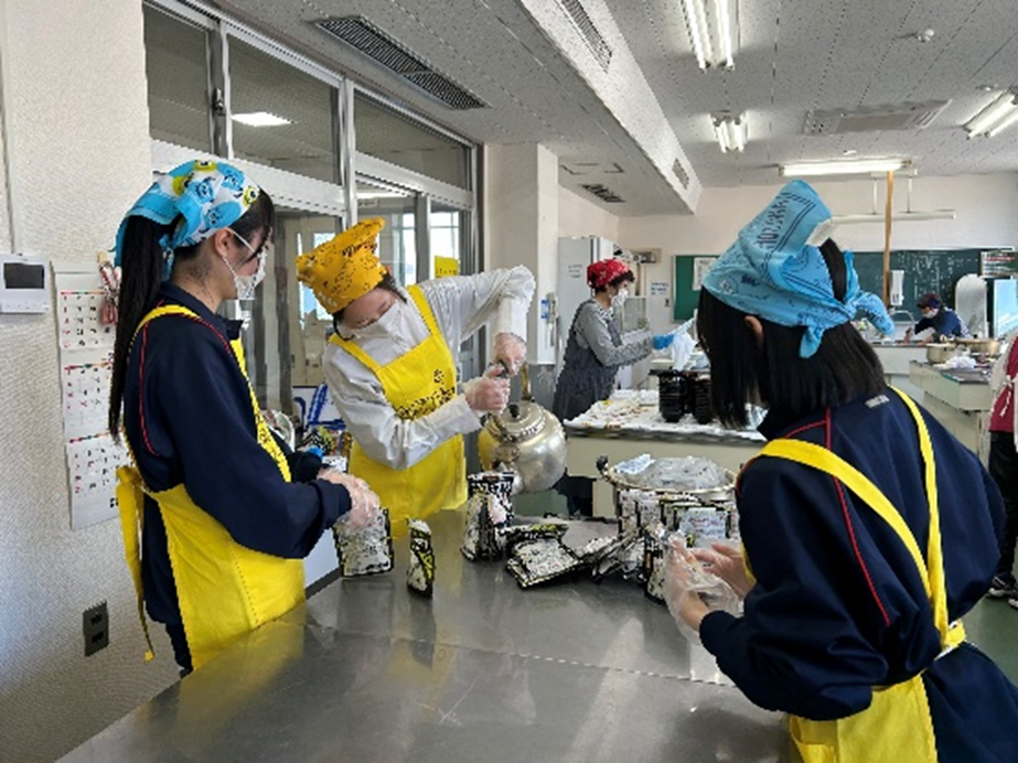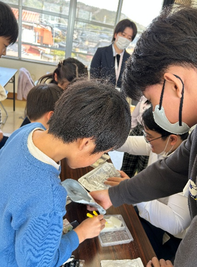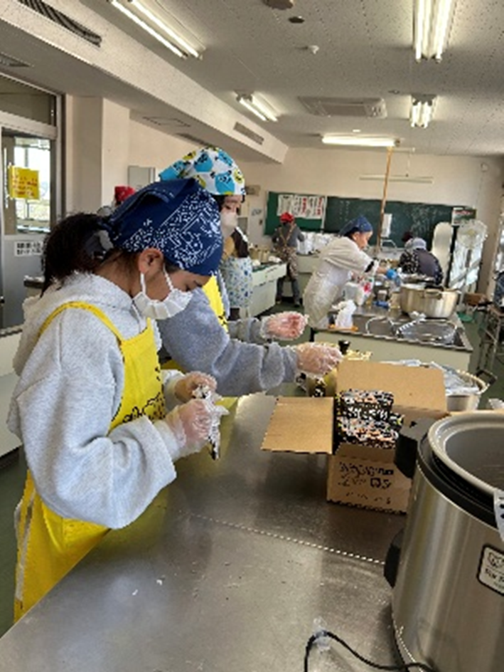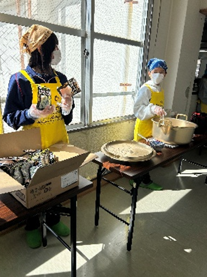 みんなが遊んでいる間に、学生ボランティアが防災食の下準備をしてくれました。