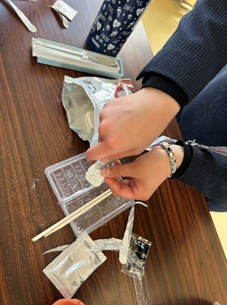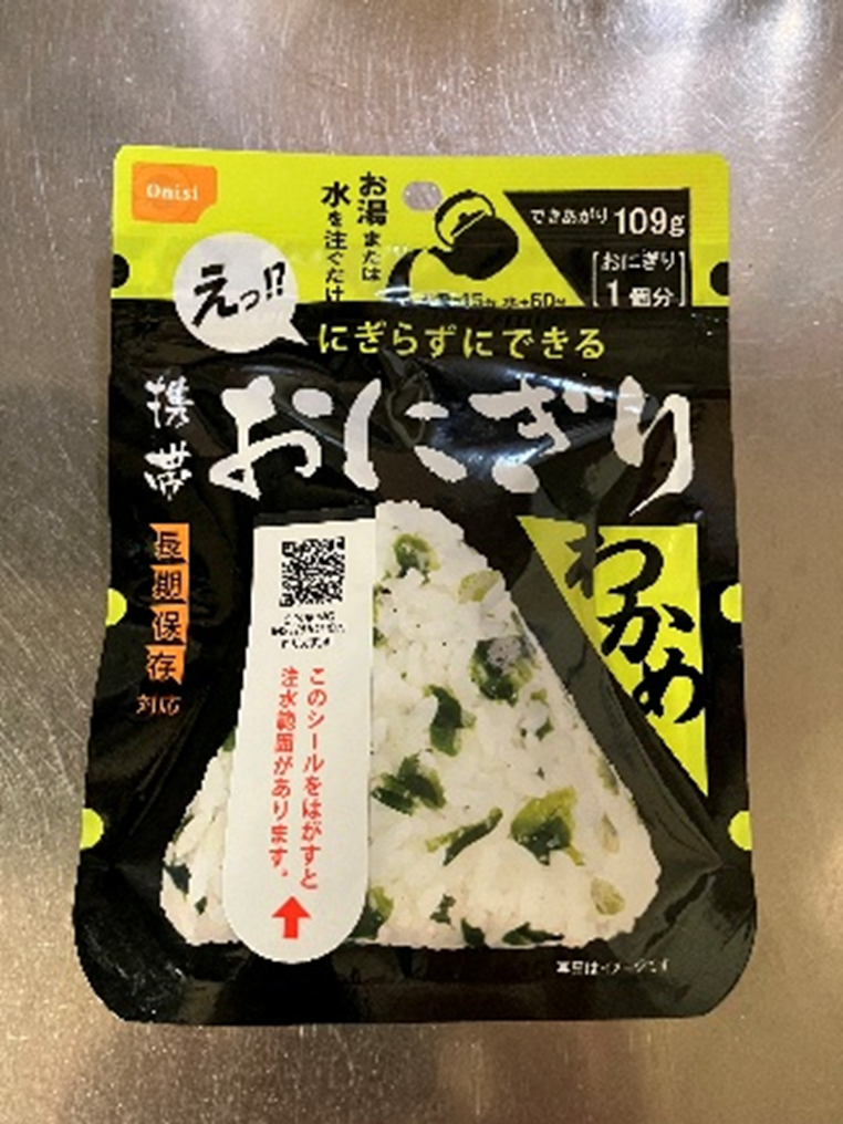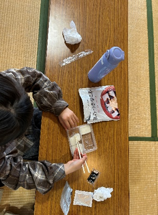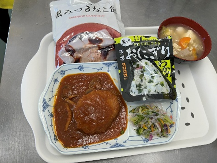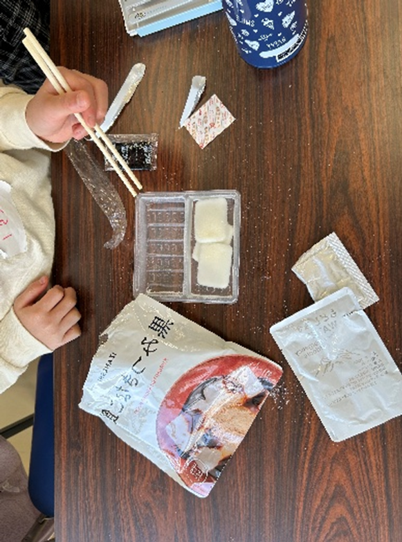 携帯おにぎりを食べるコツを教えてもらい、おにぎり・ハンバーグ・黒みつきなこ餅の防災食をいただきました。